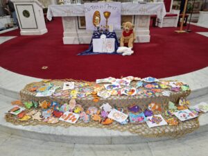 Our journey to our celebrations of First Reconciliation and First Communion has begun! We had our Enrolment Mass on Sunday 12 October when our First Communion families & children made their promises to come to Mass every weekend, talk to Jesus every day and do their best to live as Jesus would like them to. The children went home laden down with things for setting up a Sacred Space at home! Since then we have had Masses together each month. Our next Mass together in preparation for First Communion will be celebrated on Sunday 22nd February at 12.30pm. Here is a photo from our January Mass where the Gospel told the story of the 12 being called to ‘catch’ people rather than fish!